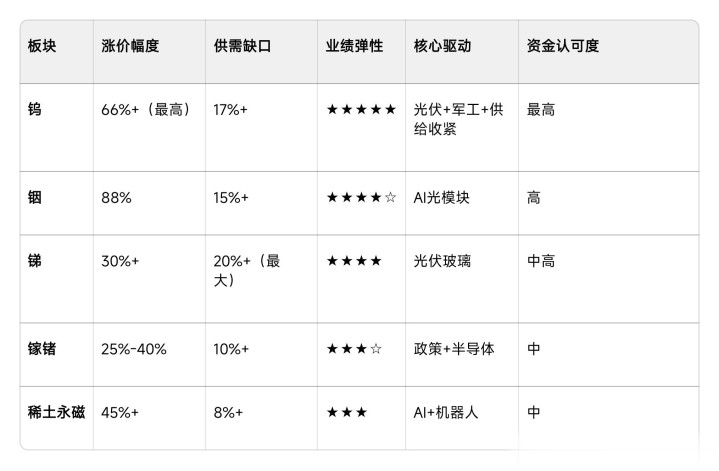 小金属这波涨价潮,不是普涨,是强者恒强、梯队分明。按涨价幅度、供需缺口、业绩弹性、资金认可度综合排序,就是你说的:钨产业链 > 铟产业链 > 锑产业链 > 镓锗板块 > 稀土永磁。